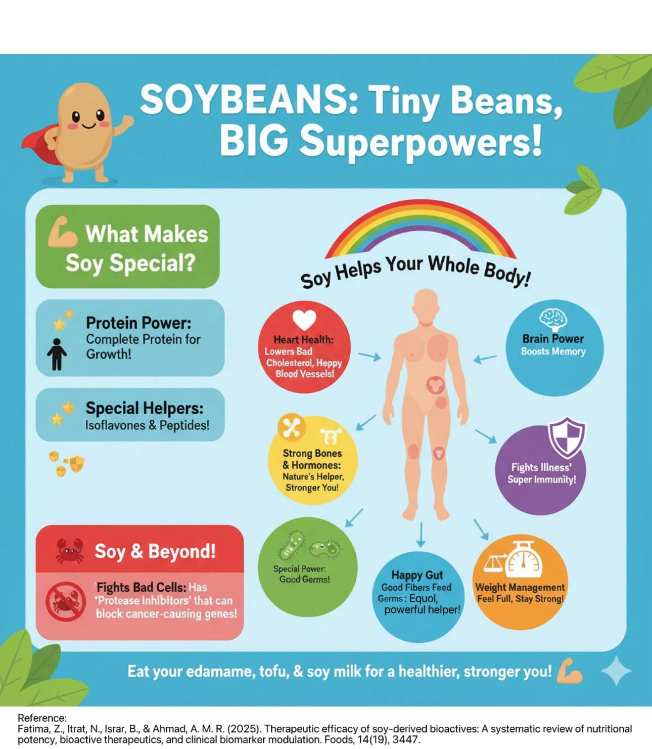 Fatima, Z., Itrat, N., Israr, B., & Ahmad, A. M. R. (2025). Therapeutic efficacy of soy-derived bioactives: A systematic review of nutritional potency, bioactive therapeutics, and clinical biomarker modulation. Foods, 14(19), 3447.